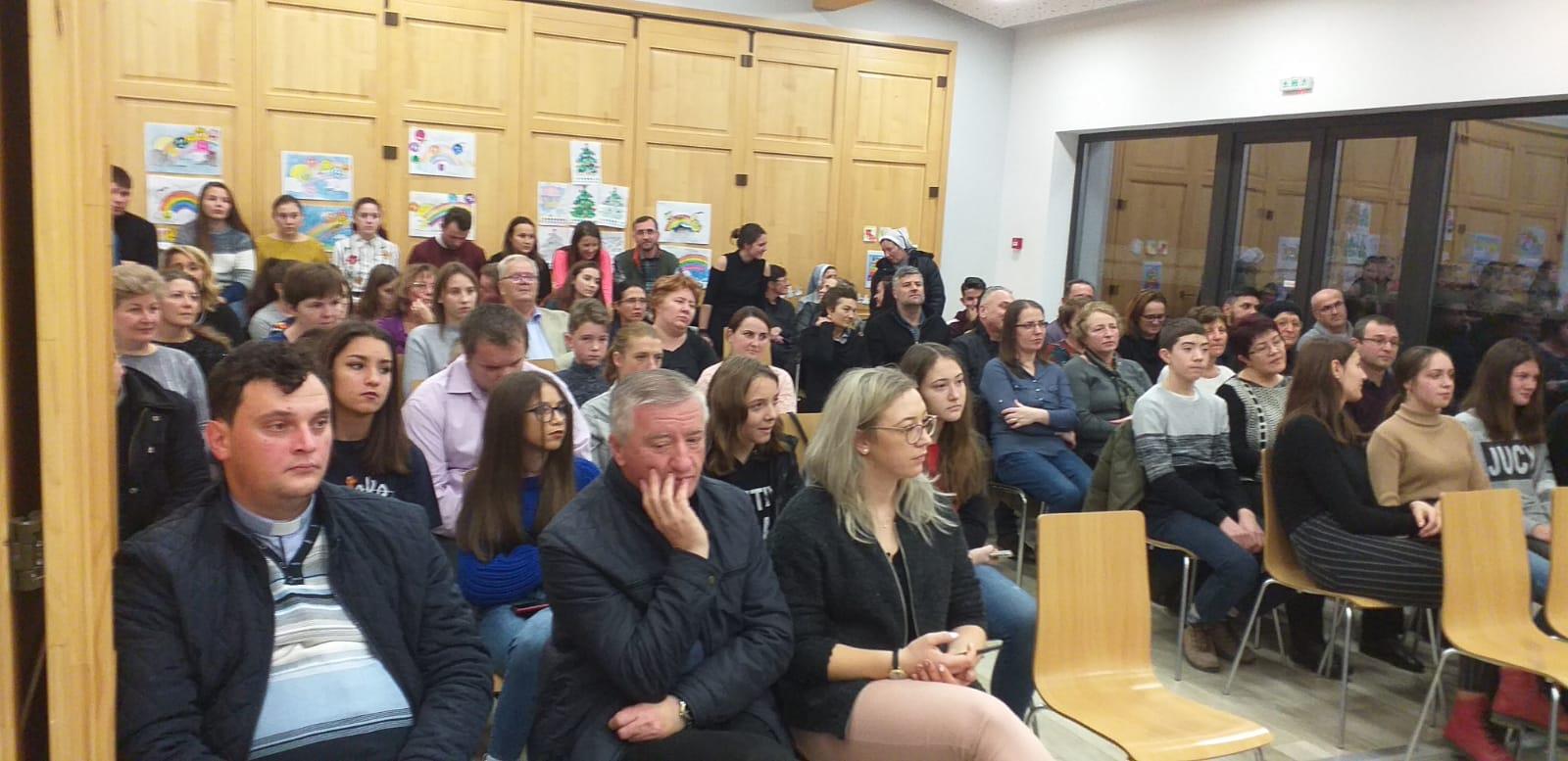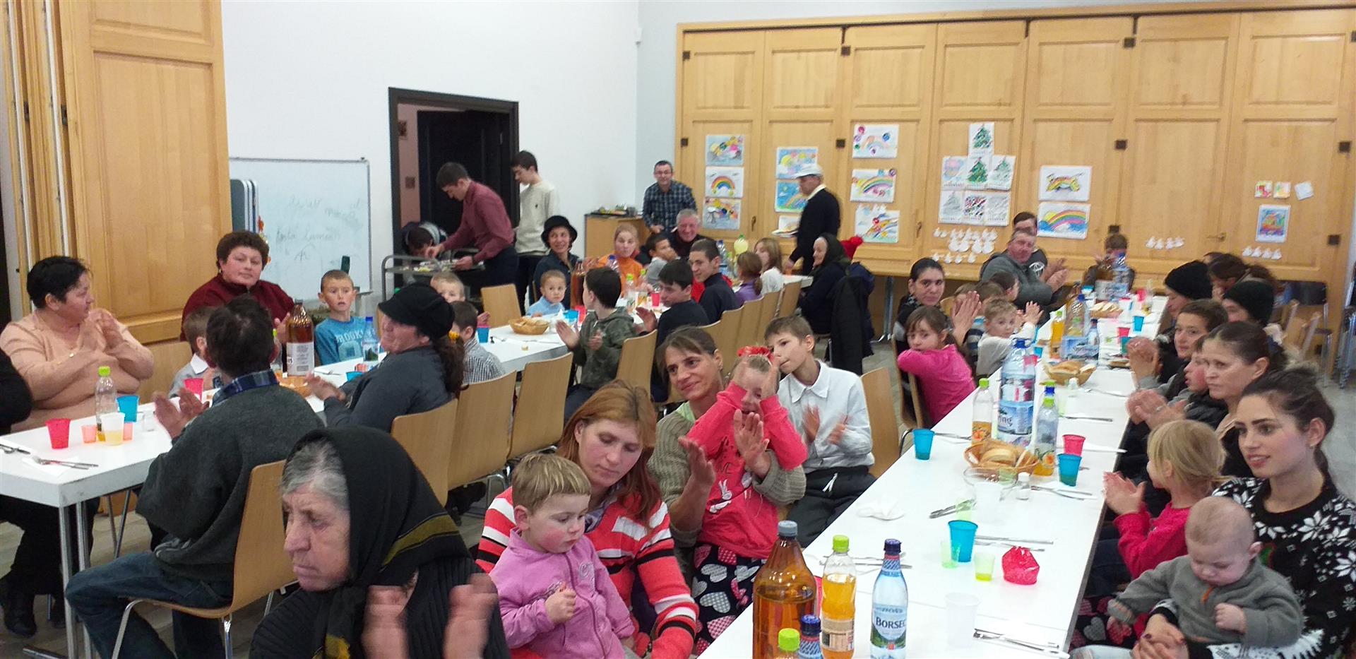 60 de persoane (10 familii, părinți și copii) s-au bucurat de această cină festivă, de un program artistic și de o tombolă cu premii. La final fiecare familie a primit un pachet cu alimente, iar copiii au primit cadouri de la Moșul.